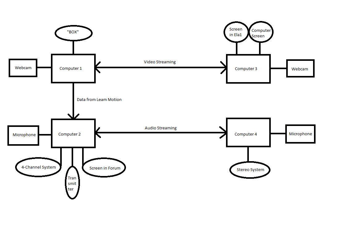 With the two rooms (Forum and ELA1), I created a set-up with 4 computers and some other necessary equipment. The general setting can be found in following figures:
