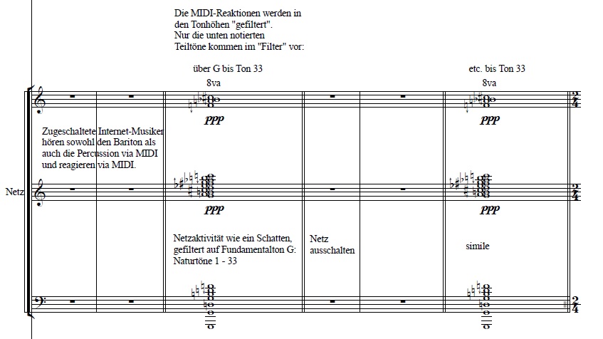 The performance was also streamed via a real stream to the remote locations and the Internet audience. It is an important fact that in 2002, the bandwidth was still under 2 M bit/s. So, there was always a 40-second delay. What the players heard and saw was always past for a while, they were answering to the baritone on stage, but not only indifferent geographic spaces, also in different time dimensions. Stahnke did not just “accepted the technical deficiency” but took advantage of it in his aesthetical pursuit. In the second scene, there is a place where he demanded the network ensemble to play but not be heard. What they played was stored as MIDI information and would be used after 84 bars. This delay by intention made the “late answer” no longer a problem to be fixed, but an artistic choice made by the composer.
