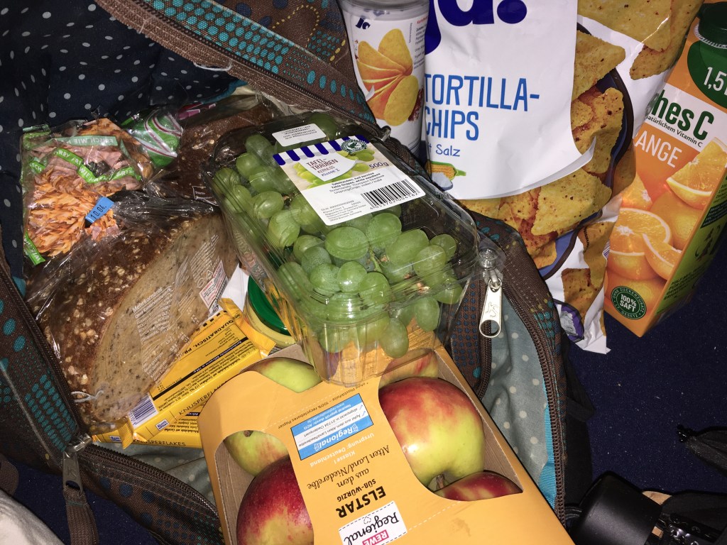 Here is part of the food. I didn’t got the rice I ordered because it’s not available, but still enough bread, bread cream, fruit and junk food.