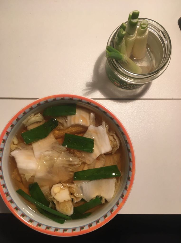 And you can see the spring onions grew a lot! It’s a bit weird to put cooked spring onions and growing ones together, it let me think of the picture of Donald the duck eating grilled duck; or the story of Tod and the chickens in Bojack Horseman.