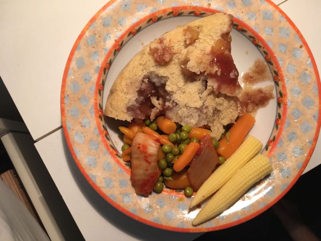 Apple pie + canned vegetable + soy sauce. Quarantine life is not only “not caring what I’m wearing” but also “not caring what I’m eating”. If I’m not hungry, I don’t want to leave bedroom for a second.