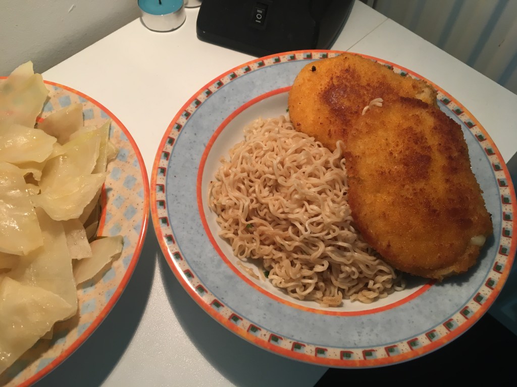 Today is the day of presentation. I was kind of nervous so I didn’t do much before the presentation, only cooked something better than days before because now I have much ingredients again. So vegetarian Cordon Bleu, dried instant noodle and German cabbage (Weißkohl). The cabbage is really hard to fully cooked and it has very spicy taste when it’s raw or partly raw. I was almost throwing away the half cooked cabbage but I just saw a recipe in social media by my kindergarten friend about how to cook cabbage. Luckily the recipe was efficient to my half cooked cabbage.